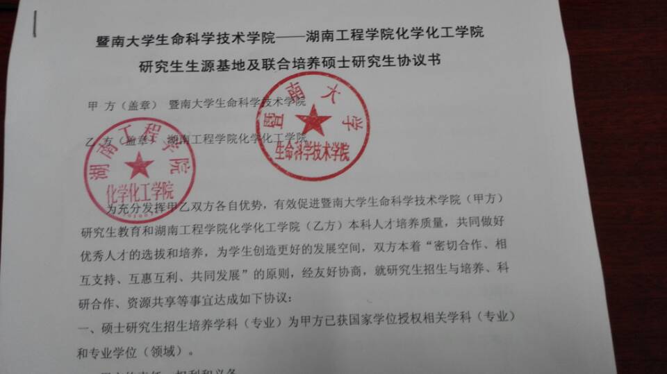 为充分发挥双方学院优势,有效促进暨南大学生命科学技术学院 (甲方) 研究生教育和37000dCm威尼斯化学化工学院(乙方)本科人才培养质量,共同做好优秀人才的选拔和培养,为学生创造更好的发展空间,近日,化学化工学院邓继勇院长与暨南大学生命科学技术学院杨维东副院长就研究生招生培养,科研合作,资源共享等事宜达成协议并签订了《研究生生源基地及联合培养硕士研究生协议书》。经双方友好协商,暨南大学生命科学技术学院 每年向威尼斯官网提供硕士研究生招生简章、宣传资料和近年硕士研究生招生考试相关科目真题,并安排专人为威尼斯官网考生进行研究生招生政策宣讲、甲方研究生培养方案以及甲方的研究方向等学生关心的内容;凡第一志愿报考暨南大学生命科学技术学院的威尼斯官网考生,当其初试成绩达到规定复试分数线且复试合格,同等情况下优先录取威尼斯官网考生,但因招生名额有限未被原报考专业录取,只要考生服从专业调剂,甲方有义务推荐乙方考生进行调剂。